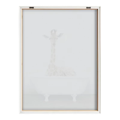 Get ready for bathtime with this little baby giraffe friend! Framed in a sleek modern frame, this contemporary design is the perfect art piece to add to your home decor collection. Printed and framed in the USA in Waunakee, Wisconsin, this printed glass art will be a pleasure to look at every day in your living room, bedroom, office, or any room in the home. This print also makes an excellent gift for a birthday, holiday, or house-warming. It also has two hangers already attached for easy wall display. The outer dimensions are 24 inches by 18 inches. Print name: “Giraffe 2 in Tub Color”