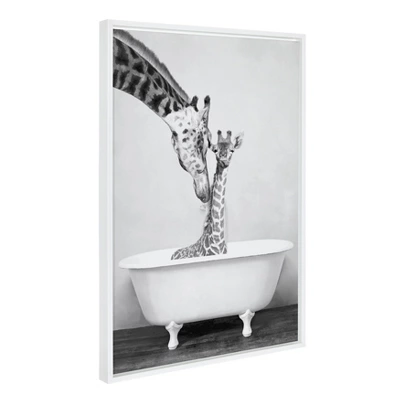 - FUNNY CANVAS WALL ART: Humorous art on framed gallery-wrapped canvas. Print name: “Giraffe in Tub” by Amy Peterson
