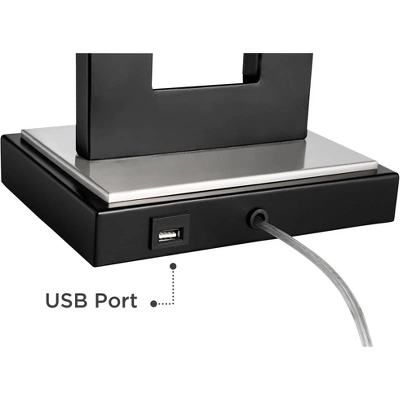 A contemporary two-tone look and convenient amenities are showcased in this modern table lamp from the 360 Lighting brand. The metal construction of this lamp comes in a handsome black finish with silver tone accents. On top is a rectangular shade that puts a crisp, clean finishing touch to this geometric design. With its charging port, this geometric, visually striking lamp is perfect for a modern bedroom or family space.