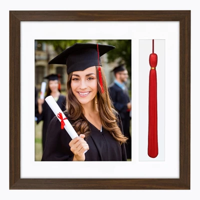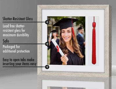 - Material: Composite wood frame with lead free tempered shatter-resistant glass that gives a clear view of your photo and tassle