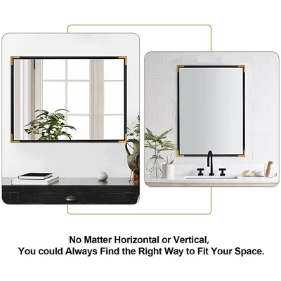 Upgrade your home decor with the ANDY STAR 30 x 40 Inch Rectangular Wood-Framed Vanity Mirror in Black and Gold.This large, rectangular wall-mounting versatile vanity mirror features 4 pre-installed D-rings that allow you to hand your mirror easily and efficiently in any space in your home. Constructed of premium materials including high-quality wood, no-distortion 4mm gloating glass, a 9mm MDF backboard, and sturdy hooks, you’ll love the way form meets function with this mirror to elevate your space. The modern gilded corners and sleek black finish match any space, regardless of the existing style or decor, making this mirror a lasting and timeless addition to your home.Featuring a simple rectangular 2-tone frame design that creates a visually pleasing effect, this mirror enhances whatever space you hang it in, adding style and elegance to your favorite spaces. The matte black finish is less reflective and resists scratches making this mirror ideal for everyday use in high-traffic areas. Measuring 30 inches long by 40 inches wide, this mirror will fill your space effortlessly.Add a touch of modern elegance to your room with the 30 x 40 Inch Rectangular Wood-Framed Vanity Mirror in Black and Gold from ANDY STAR.
