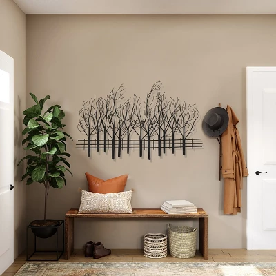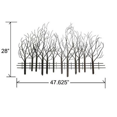 Tired of staring at a blank wall? You will fall in love with this nature theme wall decor. The metal sculpture is one-piece that features twelves trees staggered to give it a 3D effect. Behind the trees is a fence line that also gives the accent piece depth and farmhouse charm. The field of trees and fence is finished in matte black with white accents for a light snowy look. The handcrafted metal wall decoration has an openness for your wall coloring to peek through giving each piece a unique style that is specific to your style. This nature scene is a contemporary style that will complement most interior decor trends. The wall decor will look great in your bedroom, living room, family room, dining room, or entryway. It is a beautiful item that will complete any room of home!