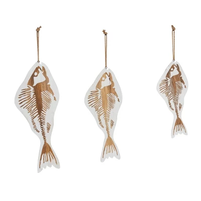 Create a balanced space in the most creative way with this expertly crafted wall decor for captivating focal point. Showcase your personality and turn your walls into an art gallery with this captivating wall decor. Bring an eccentric vibe to your coastal-themed living room or hallways with this set of hanging fish wall Decor. This item ships in 1 carton. Wood wall decor makes a great gift for any occasion. Can be hung vertically using the jute rope; nails and screws not included. Suitable for indoor use only. This item ships fully assembled in one piece. This white colored wall sculptures comes as a set of 3. Coastal style.